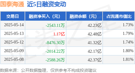 本站消息,5月14日,国泰海通(601211)融资买入2.34亿元,融资偿还2.59亿元,融资净卖出2543.11万元,融资余额42.23亿元。